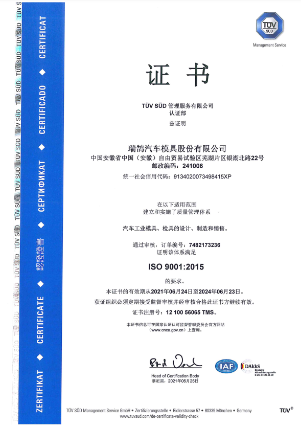 ????????瑞鵠汽車(chē)模具股份有限公司成立于2002年3月,坐落于中國(guó)(安徽)自由貿(mào)易試驗(yàn)區(qū)蕪湖片區(qū)銀湖北路 22 號(hào),股本數(shù)18360萬(wàn),公司的主營(yíng)業(yè)務(wù)為汽車(chē)沖壓模具、檢具及焊裝自動(dòng)化生產(chǎn)線的開(kāi)發(fā)、設(shè)計(jì)、制造和銷(xiāo)售,主要產(chǎn)品有沖壓模具(覆蓋件模具、高強(qiáng)板模具)及檢具、焊裝自動(dòng)化生產(chǎn)線、一體化鋁壓鑄零部件,為國(guó)內(nèi)少數(shù)能夠同時(shí)為客戶(hù)提供完整的汽車(chē)白車(chē)身高端制造裝備、智能制造技術(shù)及整體解決方案的企業(yè)之一。
